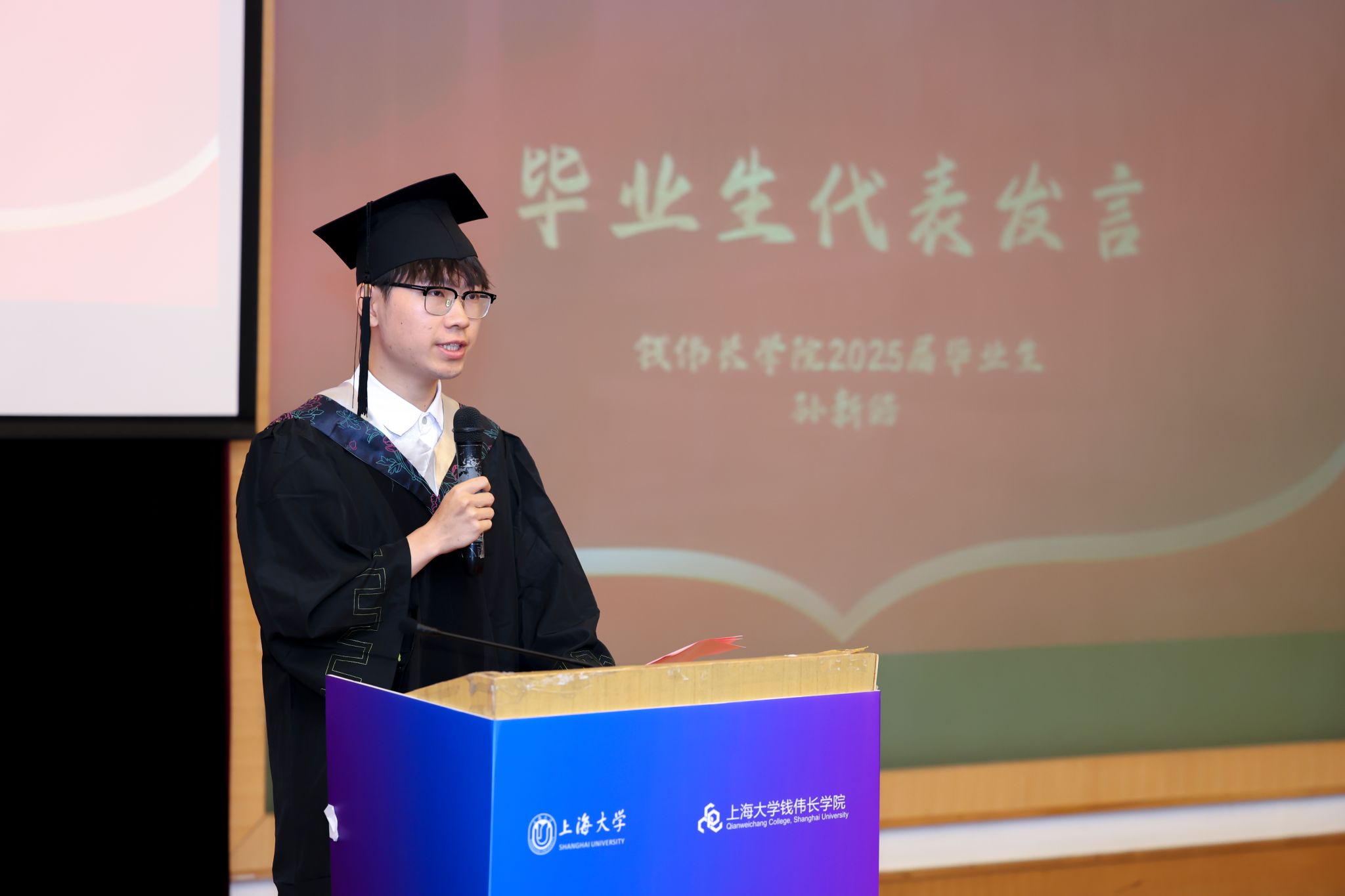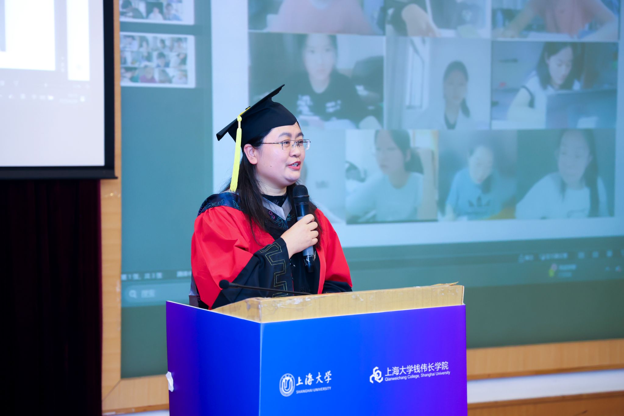 钱伟长学院导师代表白丽华老师为即将踏上新征程的毕业生们送上寄语。白老师以一张张大一线上教学时同学们在课堂和考场上专注的身影引入,回忆了本届同学认真努力的课堂表现。她鼓励同学们永远自信,“每天为自己打气,真的很管用”,也希望同学们能坚持阅读以提升和保持写作的能力,专注于知识的海洋中一直前进!最后,临行前,她代表导师们祝福同学们身体健康,前程似锦!