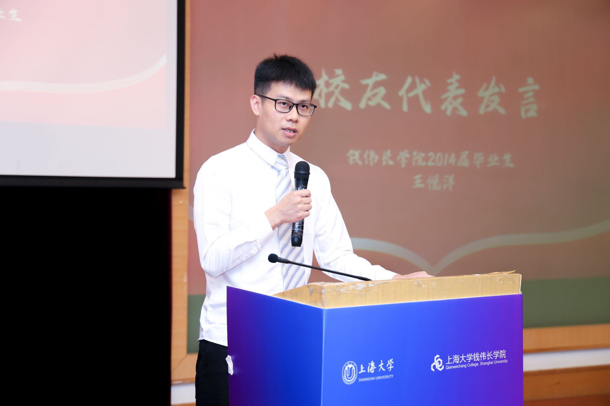 钱伟长学院2014届本科校友王悦洋学长在典礼上分享了自己学习和研究道路上的成长与感悟。王悦洋学长博士毕业于复旦大学数学科学学院基础数学专业,曾受国家留学基金委资助赴法国联合培养,后进入浙江大学数学科学学院博士后工作站,现为上海财经大学数学学院教学与科研岗讲师,主要研究领域为复分析与动力系统理论。他鼓励学弟学妹们实事求是,诚实对待科研;审慎选择方向,让努力事半功倍;不忘初心,保持研究热情,面对未来的挑战和机遇,始终保持对知识的渴望和对事业的热情,勇敢追求自己的梦想。